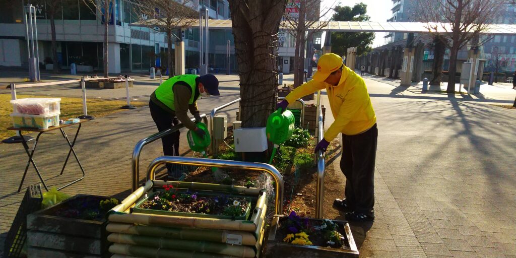 ラジオ体操開始前、ツインツリーの花壇およびプランターの花のしおれが見られたため、