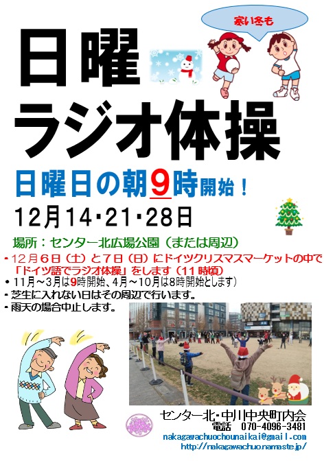 今年もドイツクリスマスマーケットin都筑2025が2日間開催されます。 日時:2025年12月6日(土)10:00~20:00 2025年12月7日(日)10:00~19:00 会場:センター北広場公園 ステージ(12月6日) 11:00 ドイツ語でラジオ体操 11:30 セレモニー 12:00 東京横浜独逸学園 12:30 BOSCHの聖ニコラウス 13:30 都筑ハーモニカクラブ 14:30 ダイアナ石山SONG&DANCEミュージカル教室 15:30 aKI 16:30 矢野音楽教室 17:00 横浜ニューライフ・フェローシップ・クワイヤー 17:30 はじめての第九 19:00 ハーモニカ奏者 安田倫 ステージの予定は変更になる場合があります。 主催:都筑・ドイツ交流イベント実行委員会 センター北商業振興会 共催:都筑区 協力:センター北・中川中央町内会 東京横浜独逸学園 ほか