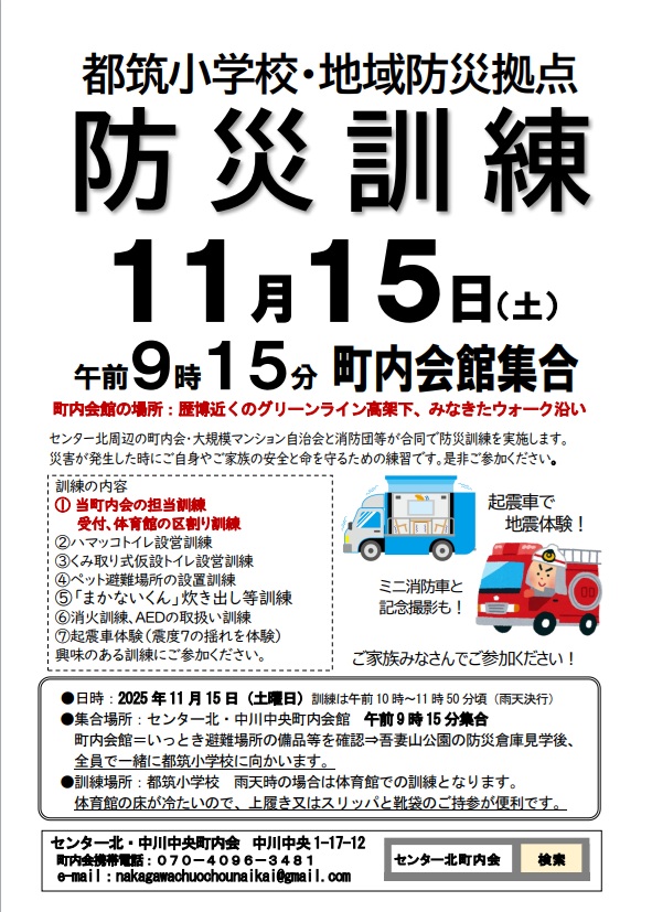 日時:2025年11月15日(土)午前9:15~12:00 場所:横浜市立都筑小学校(中川中央地区の防災拠点です) センター北・中川中央町内会の皆様は町内会館に集合していただき、都筑小学校に移動します。 集合時刻:午前9:15 集合場所:センター北・中川中央町内会館(都筑区中川中央1-17-12) ①9:15~9:28 町内会館の視察および備品の確認 ②9:28~9:35 吾妻山公園南側にある防災倉庫および中にある備品確認 ③9:35~9:55 都筑小学校へ移動(災害発生を想定し、エスカレーターを使用せず全員で歩いて) 【都筑小学校防災拠点で行う訓練項目(予定)および主担当団体】 ・起震車体験:任意参加 ・消火器訓練:任意参加 ・ミニ消防車(積載車)体験:任意参加 ・救急救命措置訓練:任意参加 ・受付・区割り訓練:センター北・中川中央町内会 ・ハマッコトイレ設営訓練:牛久保西町内会 ・非常用トイレパック訓練:港北センタープレイス自治会 ・ペット同行避難訓練:港北センターヒルズ管理組合 ・まかないくん訓練:中川東町内会 ・アマチュア無線訓練:アマチュア無線協力会、任意参加
