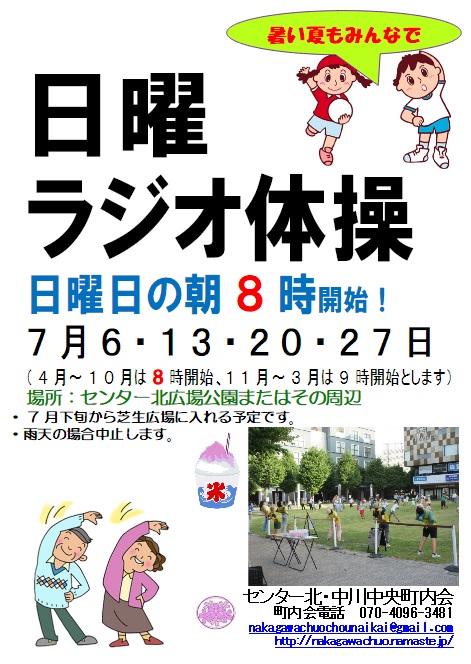 今年も三団体共催で夏休みラジオ体操を行います。 8月1日(金)~8月7日(木) 朝早いですが、お出かけ前に、または少し早起きして、どしどしご参加ください。 センター北広場公園の芝生をリニューアルしてお待ちしております。 豪華参加賞に加え、7日間毎日参加すると超豪華お菓子セットおよびモザイクモール港北様大観覧車チケットをgetできます。 (お子様のみ、数に限りがあります、雨天中止の日があった場合減算します)