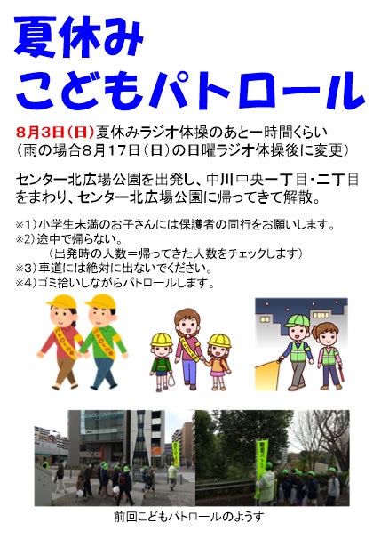 夏休みを利用して「こどもパトロール」を実施します。 夏休みラジオ体操後に行いますので、夏休みラジオ体操に参加するお子様は是非「夏休みこどもパトロール」にもご参加ください。 日時:8月3日(日)7:20頃~8:10くらい 場所:センター北広場公園出発・解散、中川中央1丁目二丁目を巡回
