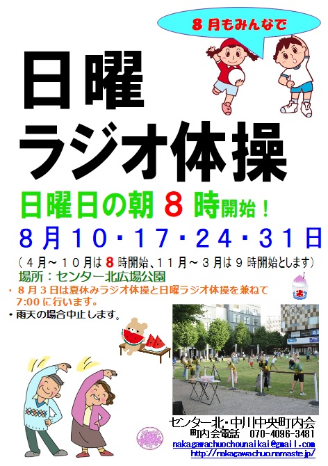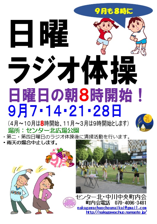 夏休みラジオ体操が終わっても、日曜ラジオ体操は続きます。 開始時刻は朝8:00に戻ります。 センター北広場公園にお集まりください。 8月中はポケモンのラジオ体操出席カードも持ってきてください。 第二、第四日曜日にはラジオ体操後に清掃活動を行います。 雨の場合はどちらも中止します。