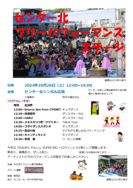 「みなきたマルシェ SUPER BIG ハロウィン」の一部として、シンボル広場(センター北駅とIJ横浜都筑中川店の間、昔噴水が出ていたところ)で『センター北・フリーパフォーマンスステージ』を実施します。 センター北・中川中央町内会の関連団体である “e-プロジェクトKITA” がステージ運営を司ります。