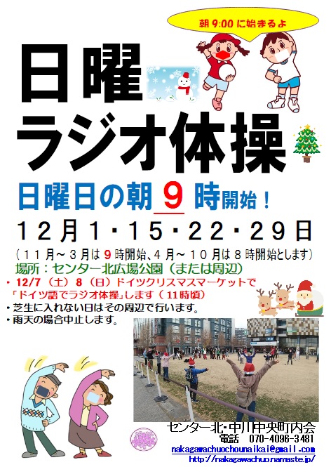 12月1日、15日、22日、29日朝9:00から日曜ラジオ体操を行います。 12月8日はドイツクリスマスマーケット期間中のため、日曜ラジオ体操をお休みにします。 但し、ドイツクリスマスマーケットの中で11時頃、「ドイツ語でラジオ体操」を行う予定です。 (音響準備が整ってからのため、時刻は不確定です。)