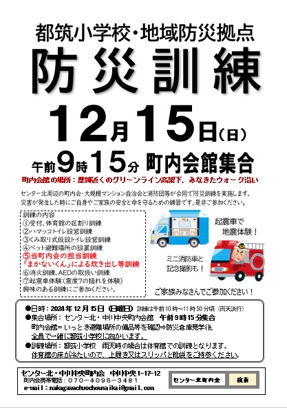 集合日時:2024年12月15日(日)9:15 集合場所:センター北・中川中央町内会館 センター北・中川中央町内会防災倉庫を経由して、横浜市立都筑小学校へ移動 同日10:00~12:00に、都筑小学校防災拠点設営訓練 当町内会の分担:まかない君を使った炊出し訓練 分担以外の訓練:消火器操作、応急救命措置、起震車、積載車