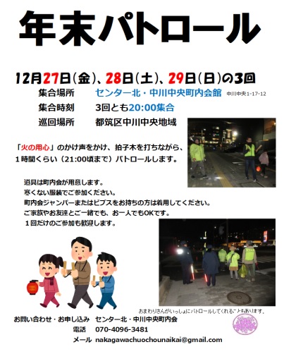 今年も年末パトロールを実施します。 日時:12月27日(金)20:00~21:00 12月28日(土)20:00~21:00 12月29日(日)20:00~21:00 集合場所:センター北・中川中央町内会館 寒くない服装でご参加ください。 拍子木、携帯カイロ、懐中電灯、軍手は町内会で用意します。