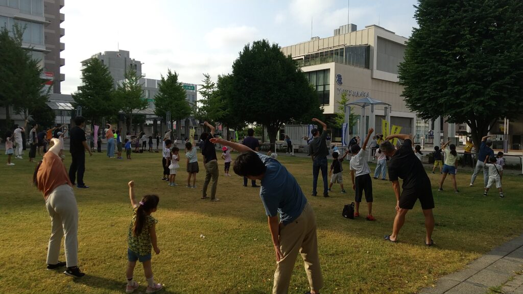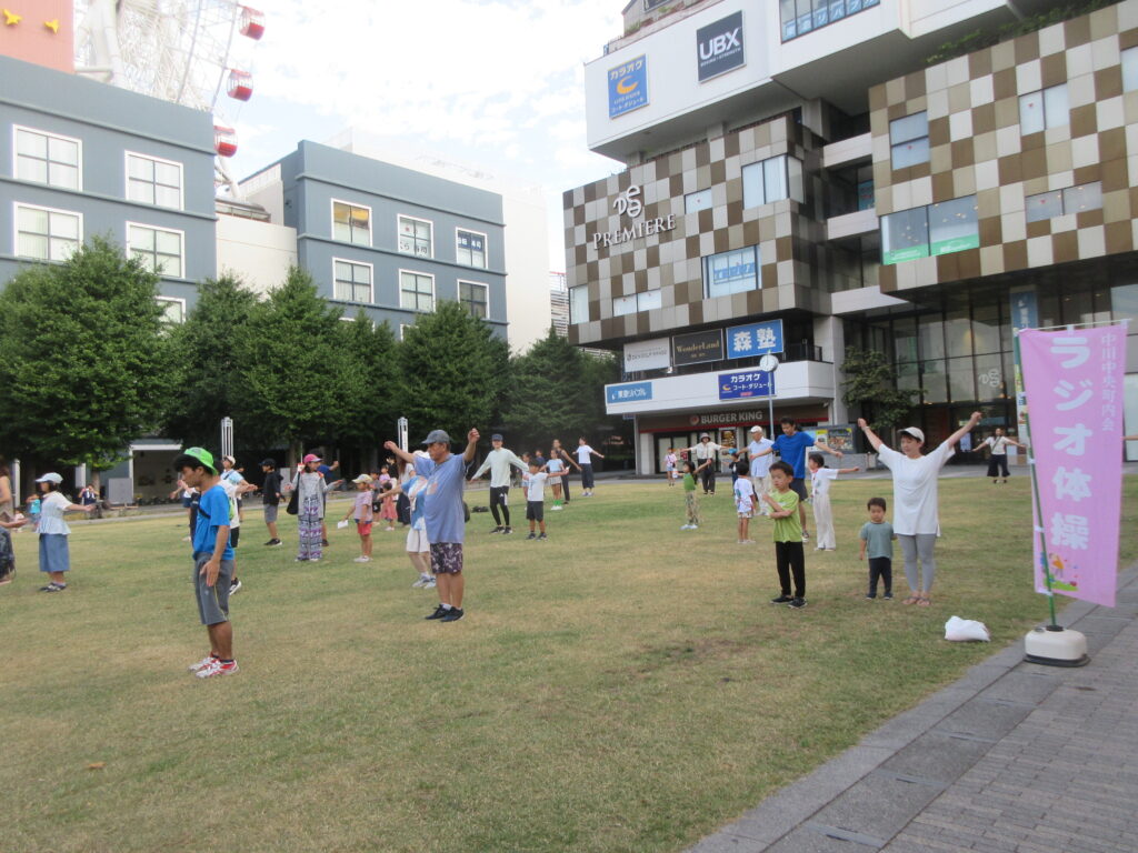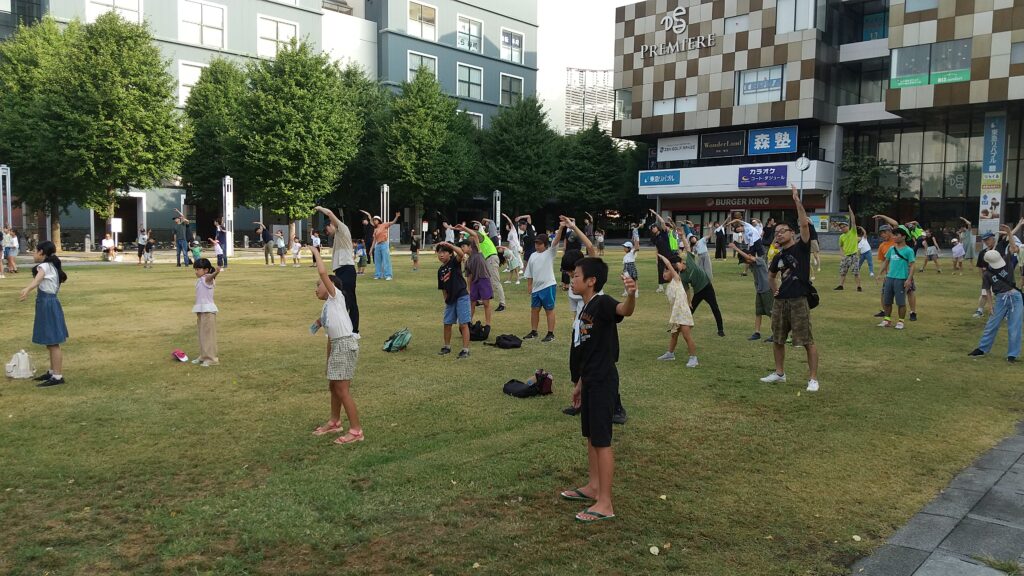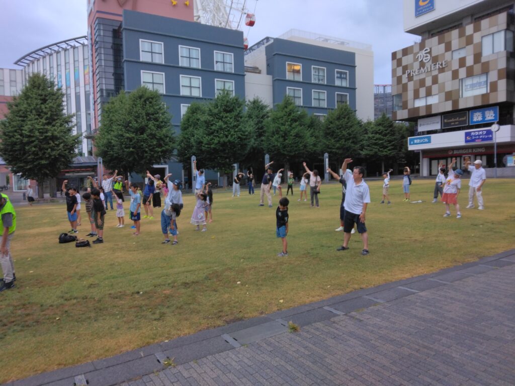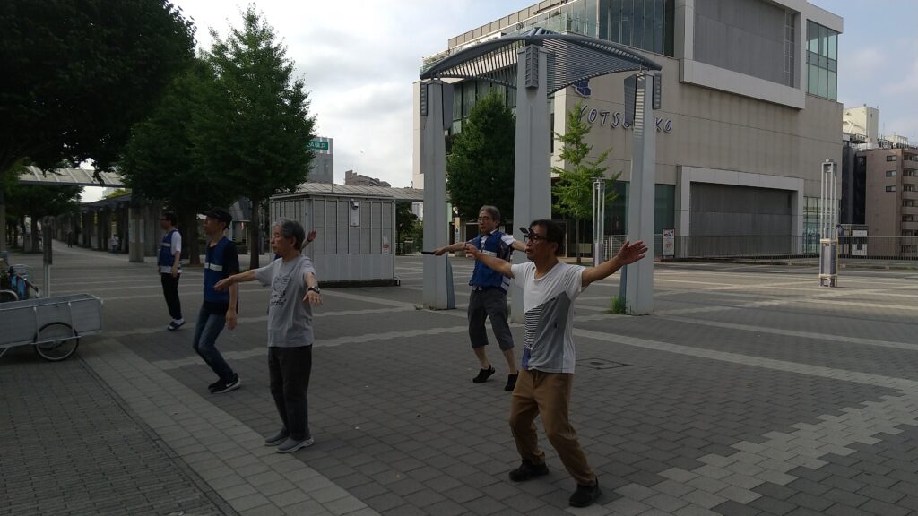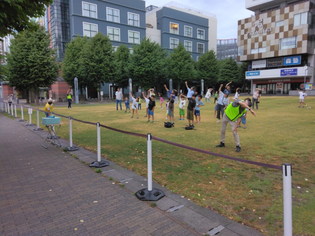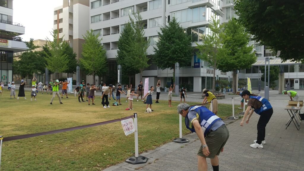 7:00丁度に、港北センタープレイス自治会の幹事の号令により、ラジオ体操第一を開始しました。