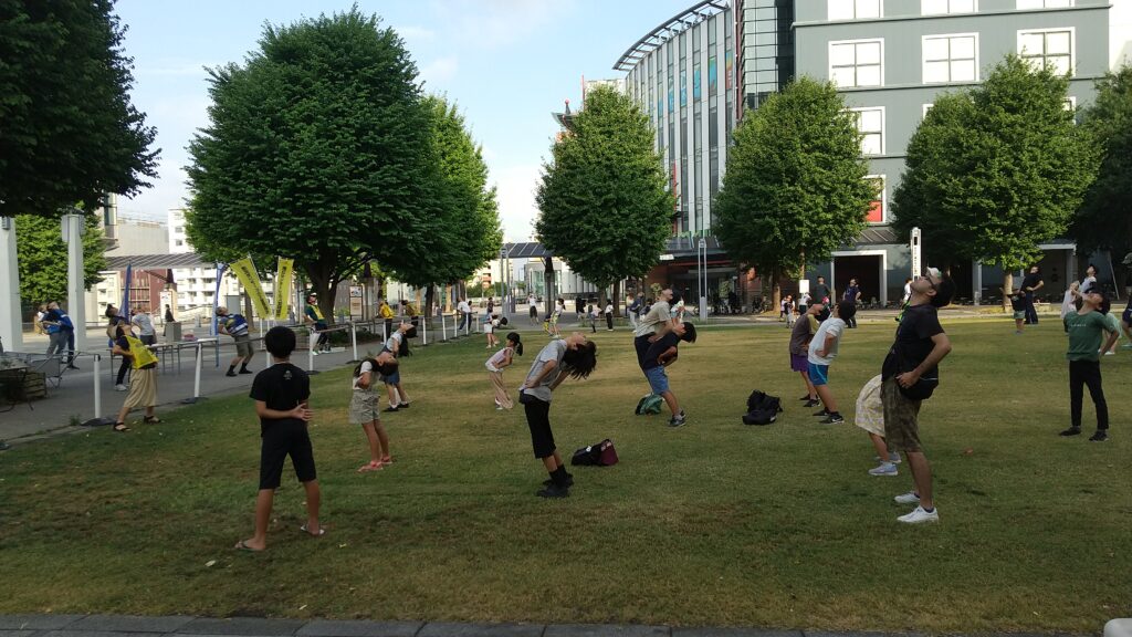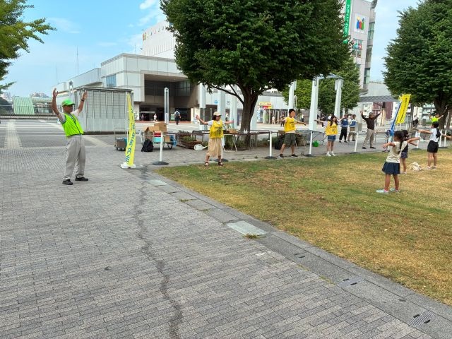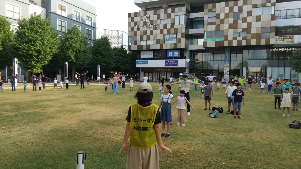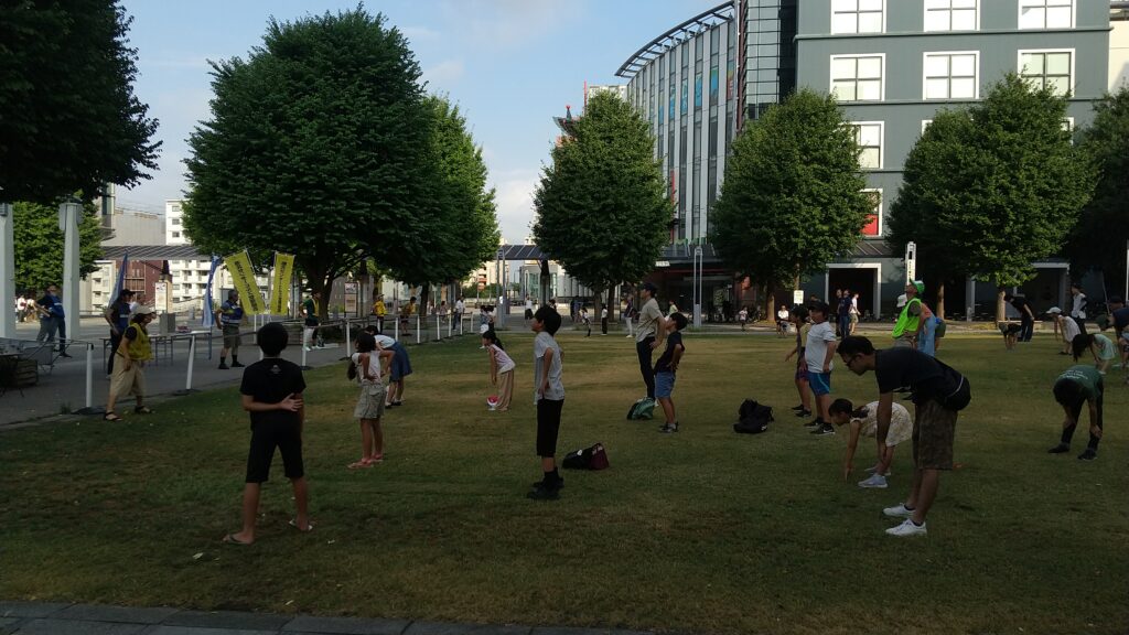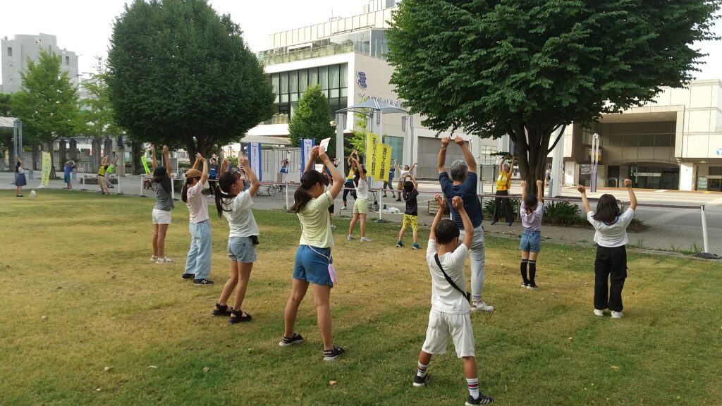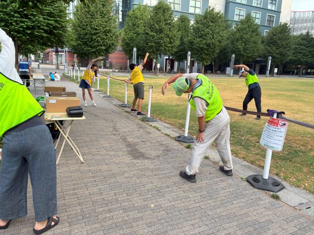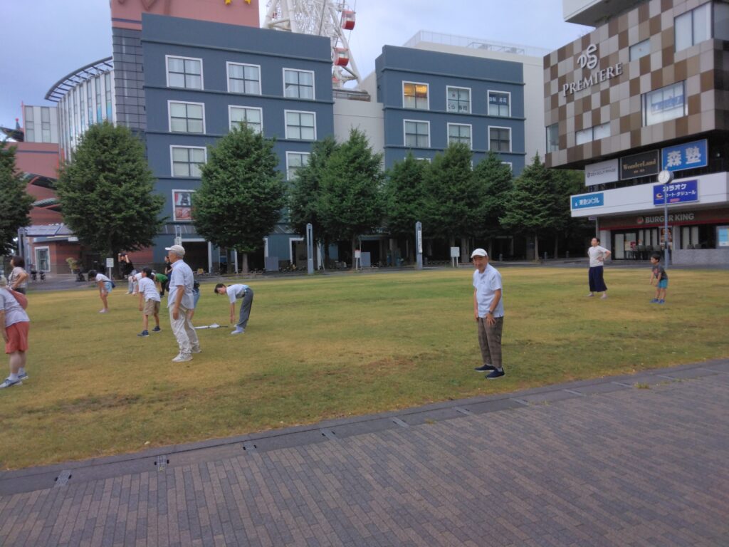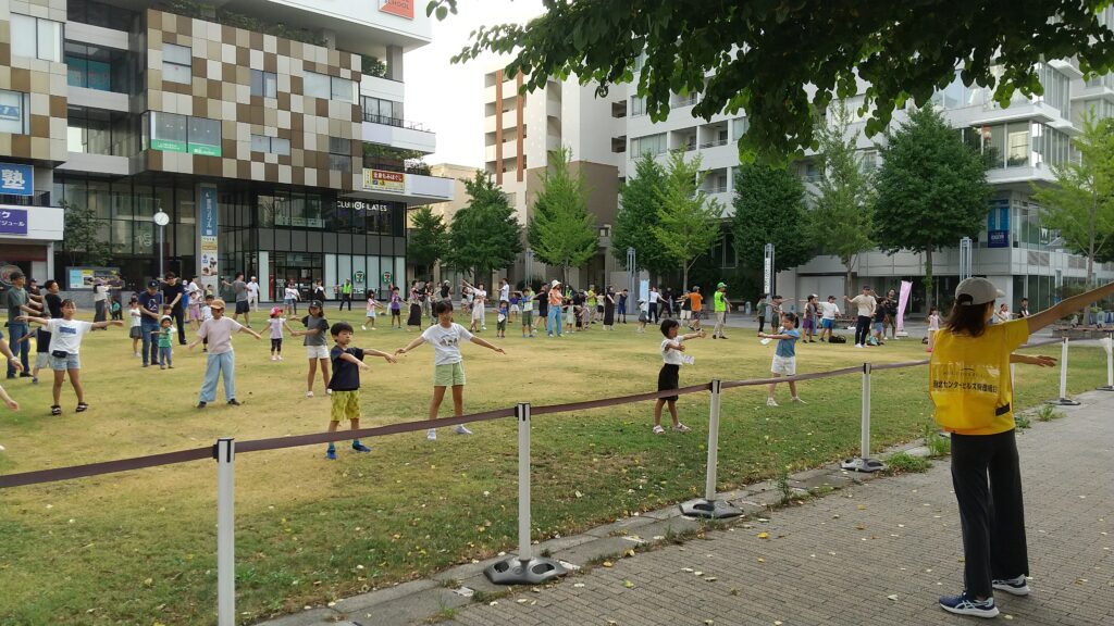 7:00丁度に、港北センタープレイス自治会の幹事の号令により、ラジオ体操第一を開始しました。