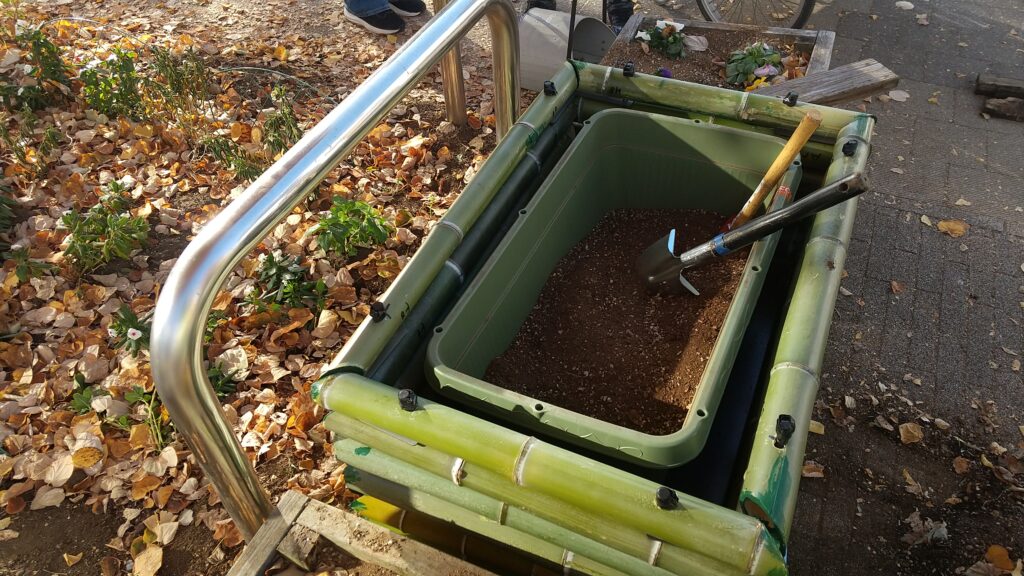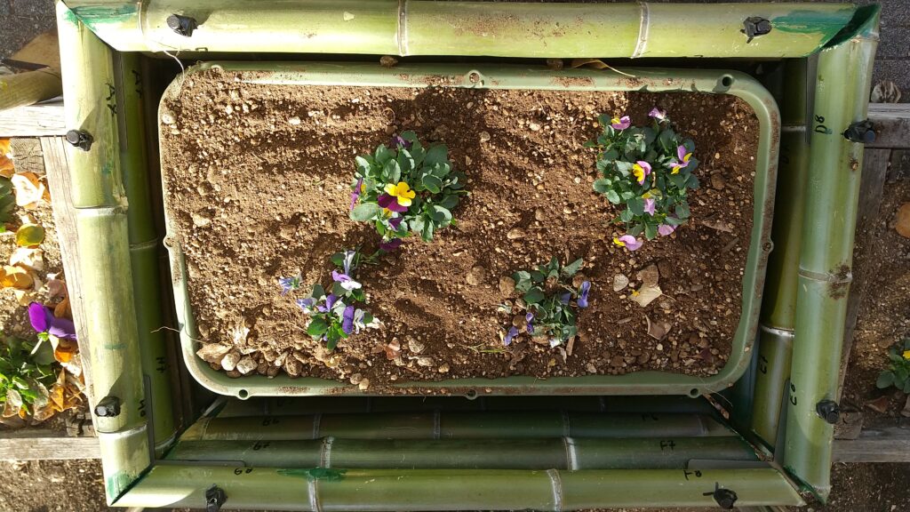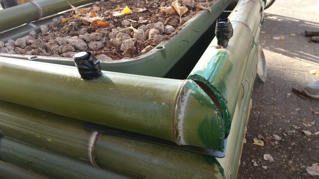 ベアレントさんが吾妻山の竹で制作したプランターボックスに長方形プランターを入れ、