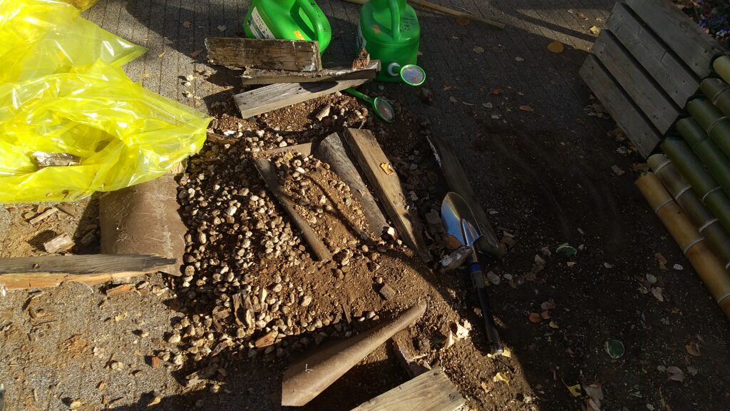 ラジオ体操終了後、ツインタワー横の花壇横の木製プランターが腐朽したため、