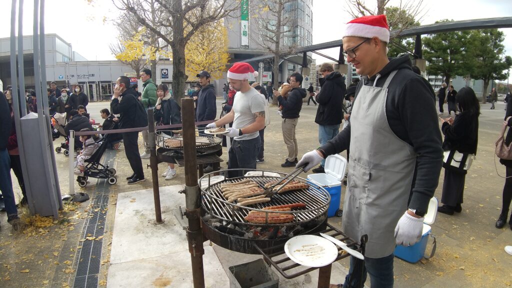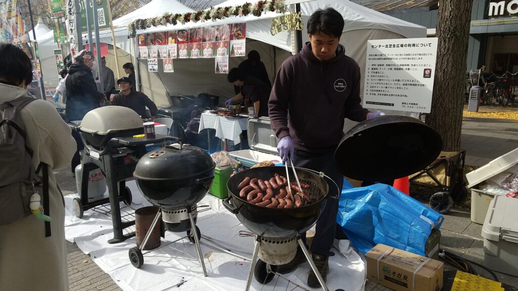 炭火コンロでフランクフルトソーセージを焼く実演が行われ、香ばしい匂いが会場に広がりました。