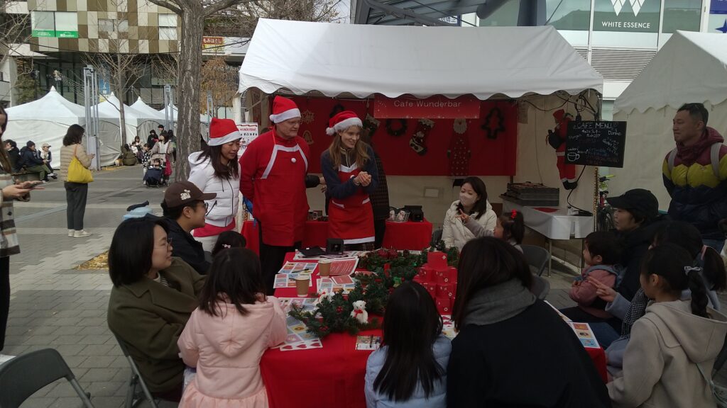 ソーセージ、チーズケーキ、グリューワイン等を販売しておりました。