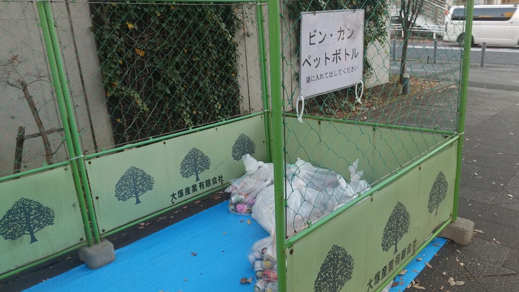 噴水広場にゴミ収集場所を設置し、ゴミステーションで一杯になった袋をこちらへ運びました。