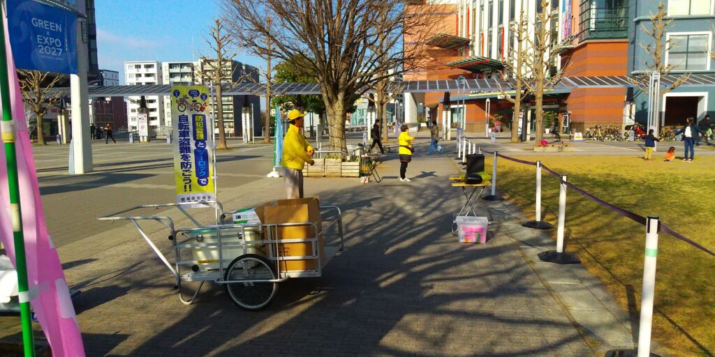 噴水広場の倉庫よりトングとゴミ袋を持って、中川中央一丁目を巡回して、路上のゴミを拾って頂きました。
