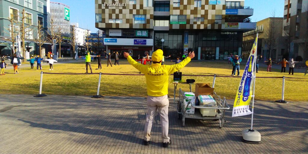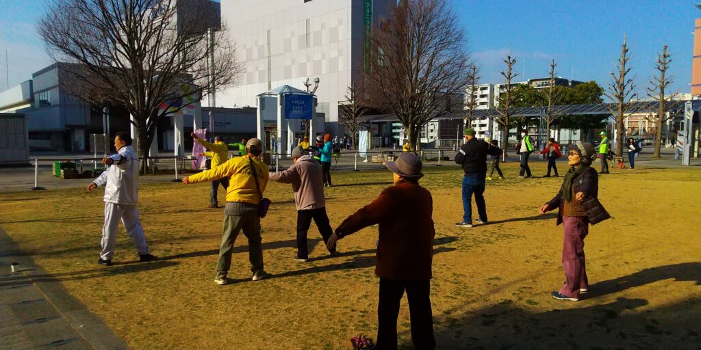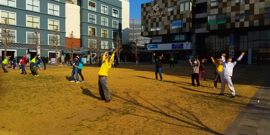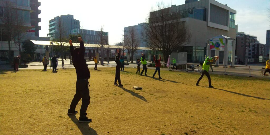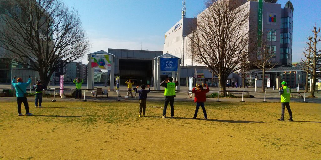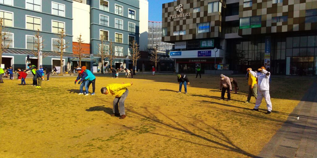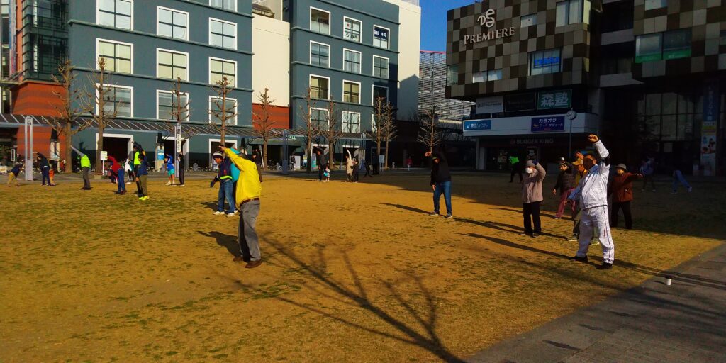 ラジオ体操第一、皆で一緒にしようや。