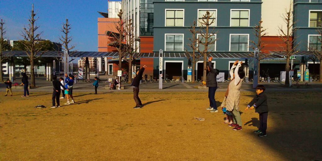 腕を前からゆっくり上げて、大きく背伸びの運動じゃけぇね。(広島弁の号令)