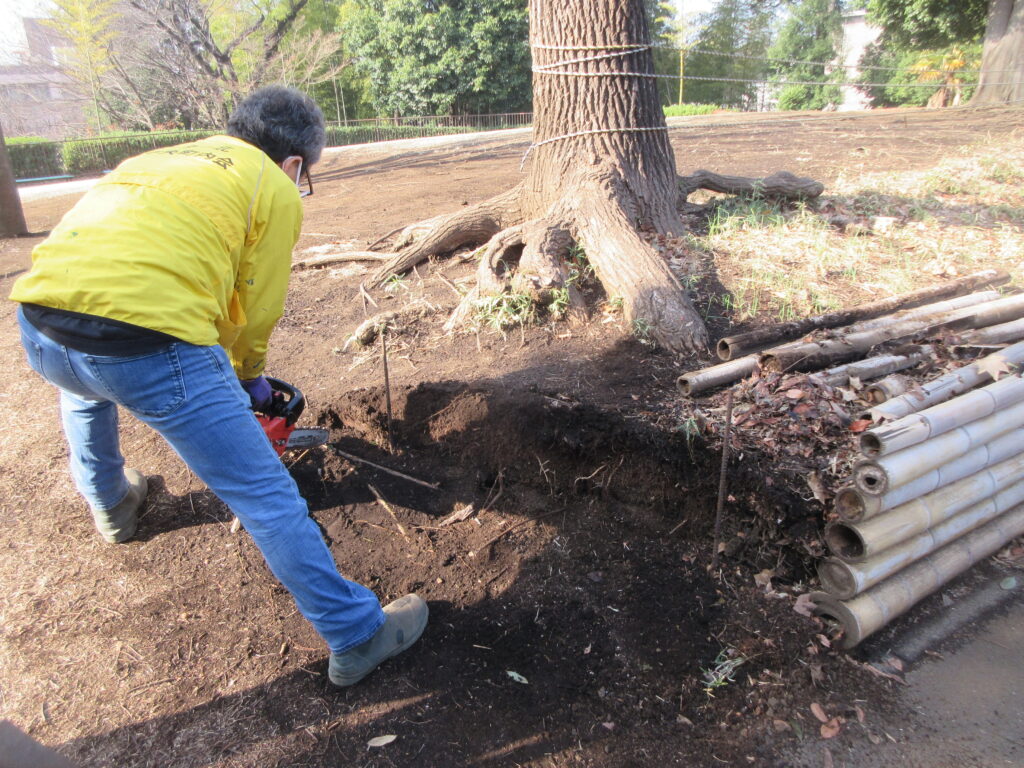若干土を掘るために、根をカットしています。