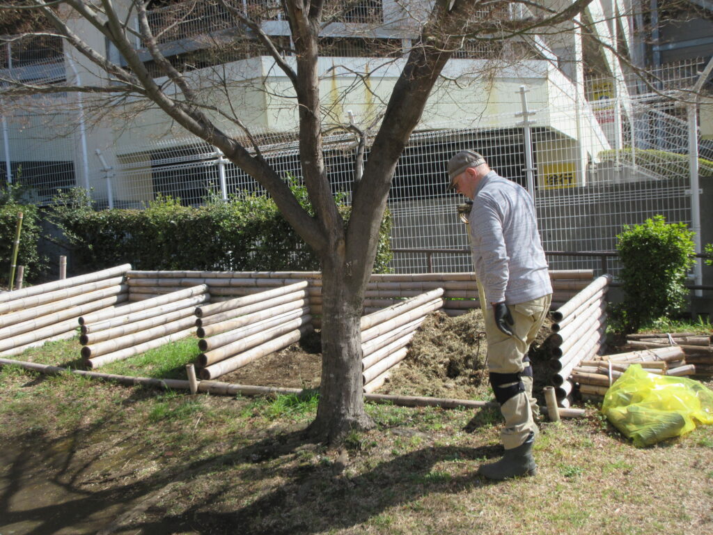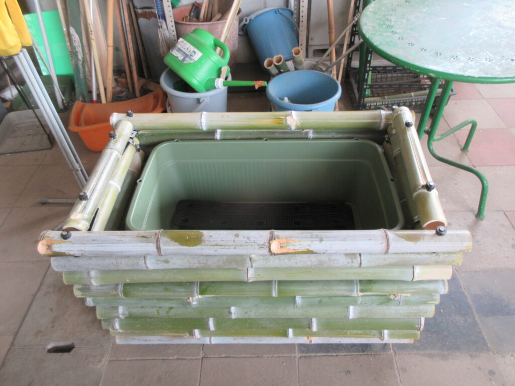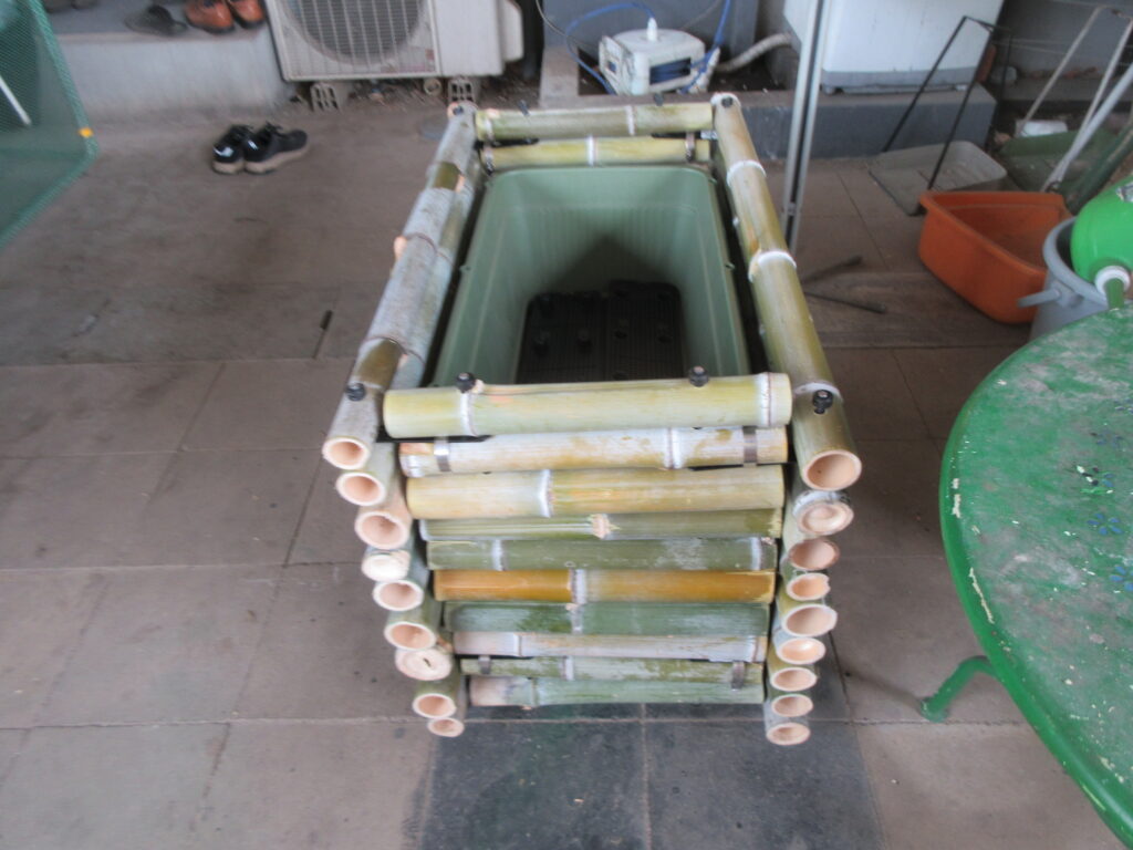 町内会館に戻ると、竹製プランター3号機が完成していました。